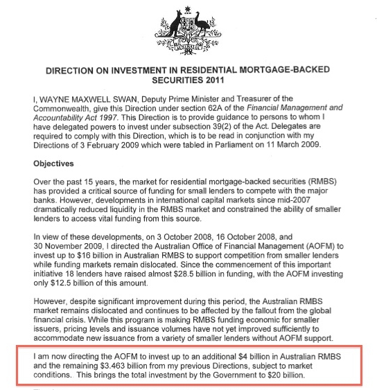 But $16 Billion wasn’t enough. Just last month, Wayne Swan authorised the AOFM to “invest” another $4 Billion in these “mortgage backed investments”:
