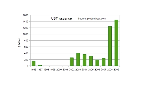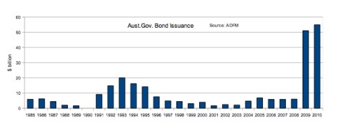 As you can see, government debt issuance has reached levels never heretofore imagined. UST issuance reached almost $1.5 trillion in 2009. While the dollar amount of Australian government debt issuance is small in comparison to the US, the pattern of expansion is the same. I have included Australian government debt issuance back to 1985 to give some perspective of historical issuance. I don’t have figures pre 1996 for UST’s, nor 2010. Nevertheless, you get the picture.
