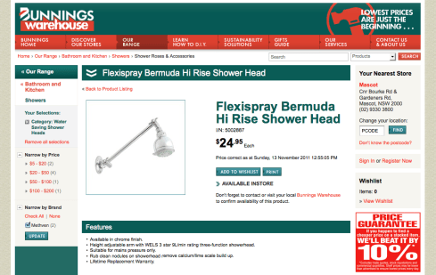 … and you will fail to notice that you can buy a fancier one at Bunnings, with 3-function adjustable spray, and a new height adjustable arm and baseplate, for just $24.95: