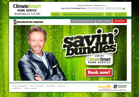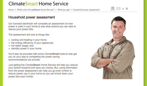 ClimateSmart Home Service: For just $50 of your hard-earned money … AND your signature handing over all your household’s rights and entitlements to any future carbon abatement credits … we’ll give a bunch of eco-crap that you could buy yourself on eBay and at Bunnings for about $175. It’s all bottom-of-the-range rubbish that we bought for next-to-nothing by the container load from China. But it will make you feel good about yourself to do this, and will help assuage a little of the climate guilt trip that we’ve laid on you day-in day-out for years. You can even imagine that it’s helping you reduce the rate at which your electricity bill is inevitably and irresistibly going through the roof, thanks to our new Bob Brown-mandated Big Bankster Bonus-facilitating carbon tax.