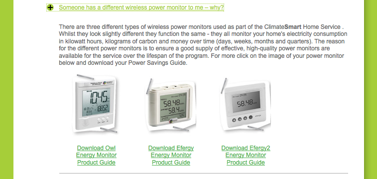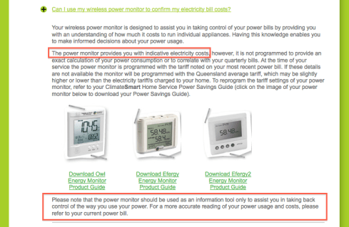 You will also fail to notice that the “wireless power monitor” is just a gimmick that even the government concedes (in the fine print) “provides indicative electricity costs” only (ie, guesses); an “information tool” of dubious efficacy that can not be used to calculate your actual electricity costs … even though the promo page of the government website claims “it is a handy little device that shows you exactly how much electricity you are using“: