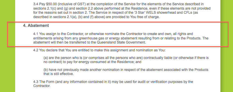 When you sign the ClimateSmart contract, you are signing over “all rights and entitlements arising from any greenhouse gas or energy abatement resulting from or relating to the Products. The abatement will then be transferred to the Queensland State Government”: