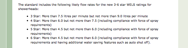 You will fail to notice that the government has not told you that a ‘3 Star’ WELS rated showerhead is the lowest of the new 3-6 star WELS ratings, and that a 6 Star rated showerhead would use only 6 litres per minute (33.3% less):