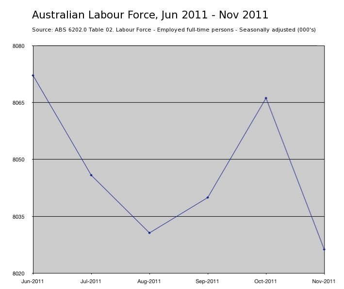 # In total in November 2011 an estimated 1,982,000 (16.3%) of Australians were unemployed or ‘underemployed.’ This is up 108,000 (0.6%) on October 2011 and up 355,000 (2.6%) since November 2010.