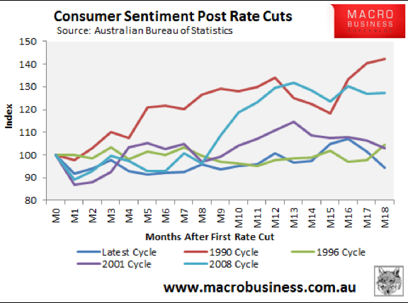 In fact, sentiment has crashed out of its uptrend and is now well below where it was when the rate cuts began: