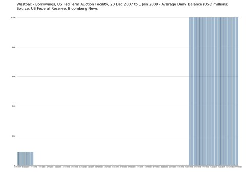 Between 20 Dec 2007 and 16 Jan 2008, Westpac secretly borrowed USD90 million per day from the US Federal Reserve. Between 9 Oct 2008 and 1 Jan 2009, Westpac borrowed USD1 billion per day. For a total of 113 days, Westpac was surviving on daily loans from the US Fed: