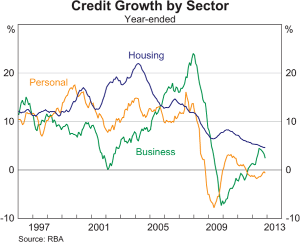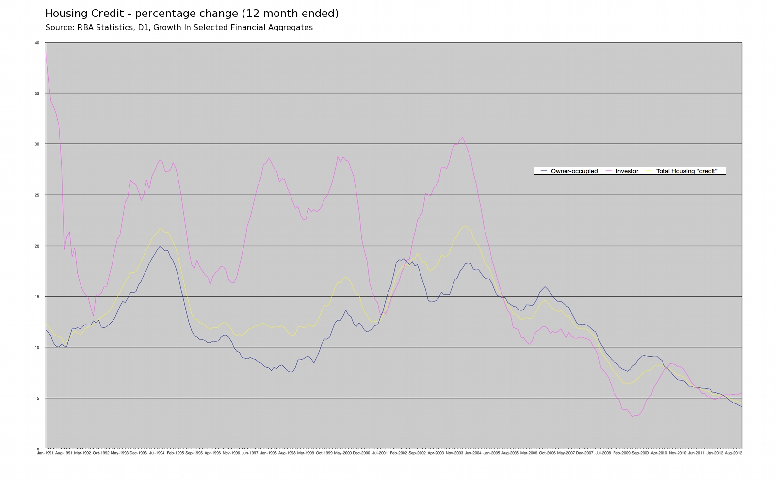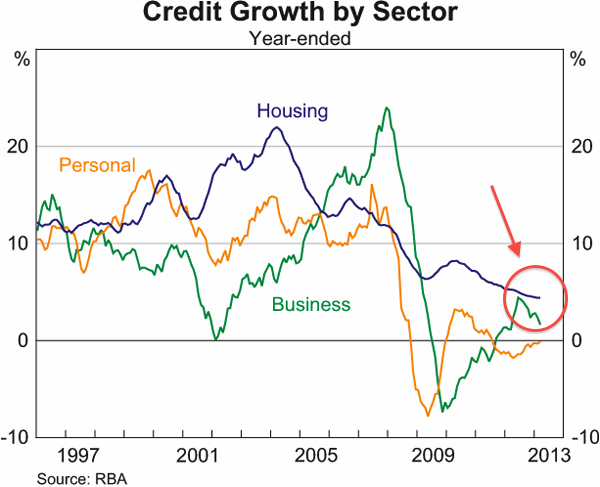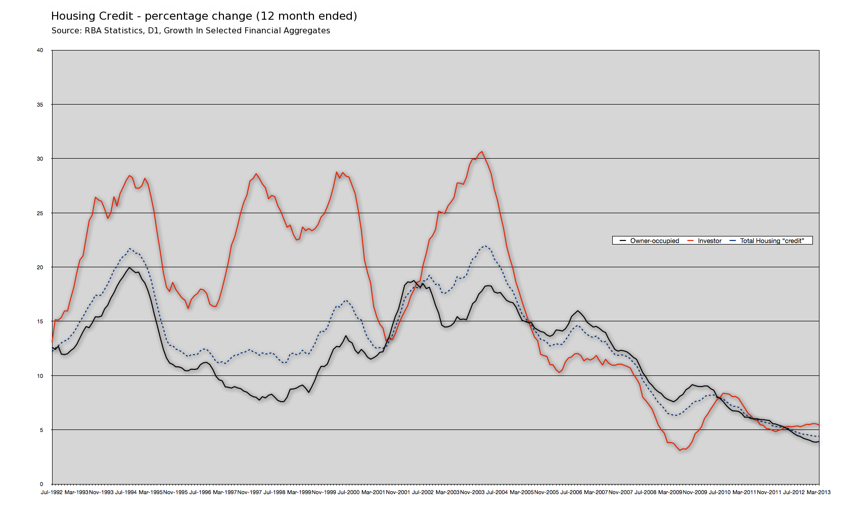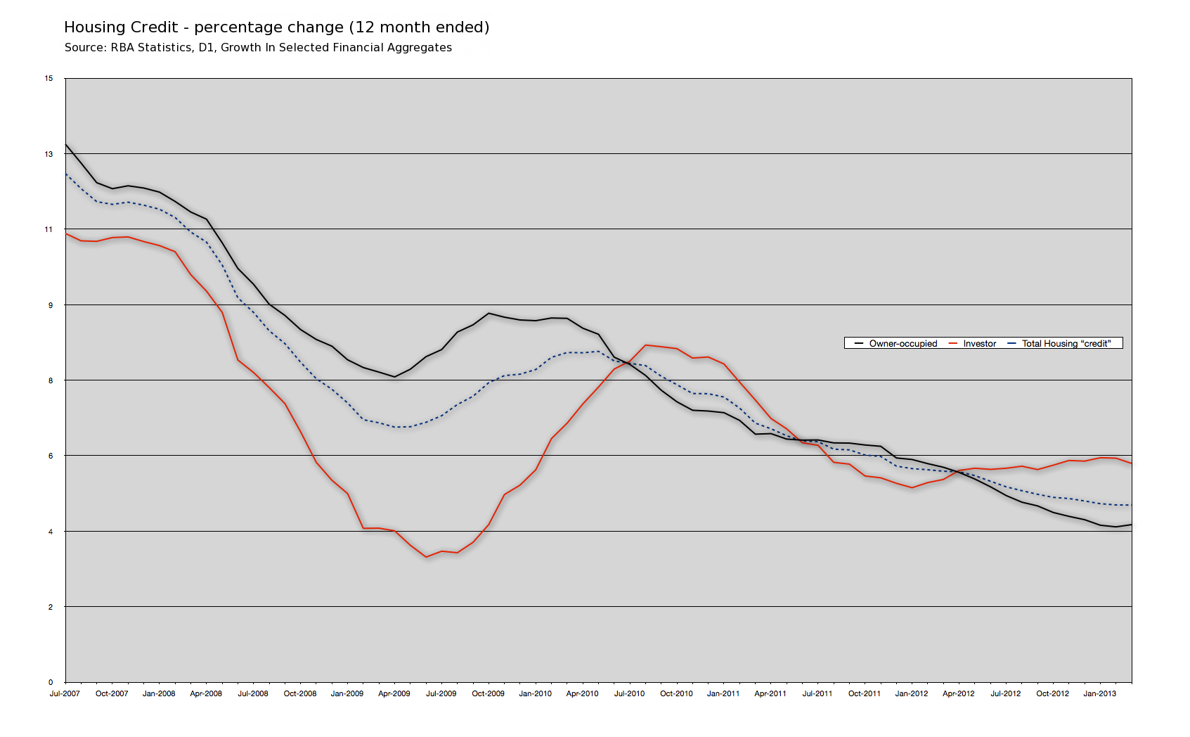 Correction – how careless of me! The RBA does indeed provide a chart in their chart pack that shows the growth rate in “credit” for housing.  Simply select “5. Credit and Money“, then choose “Credit Growth by Sector” –