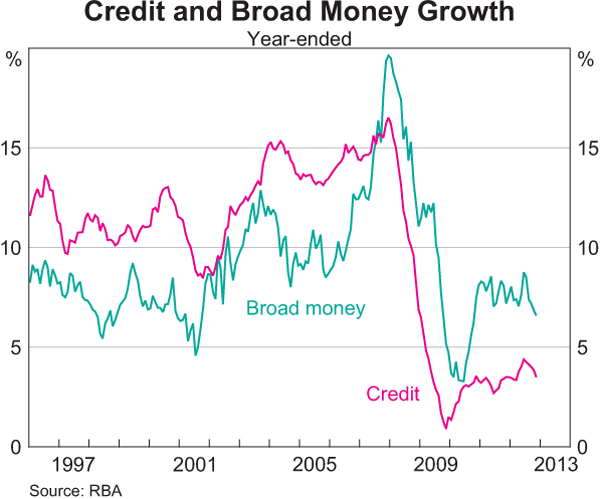 Whenever this coming bombardment of propaganda causes you to wonder if what they are all saying might just be true; when the charts and statistics and testimonials from credible-sounding people causes you to start feeling “con-fident” about Australian housing, come back and read this post again.  Or visit the RBA’s website, and click on the Chart Pack to see the Credit and Broad Money Growth chart.