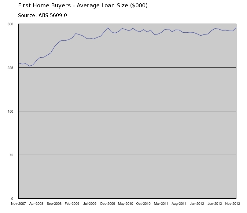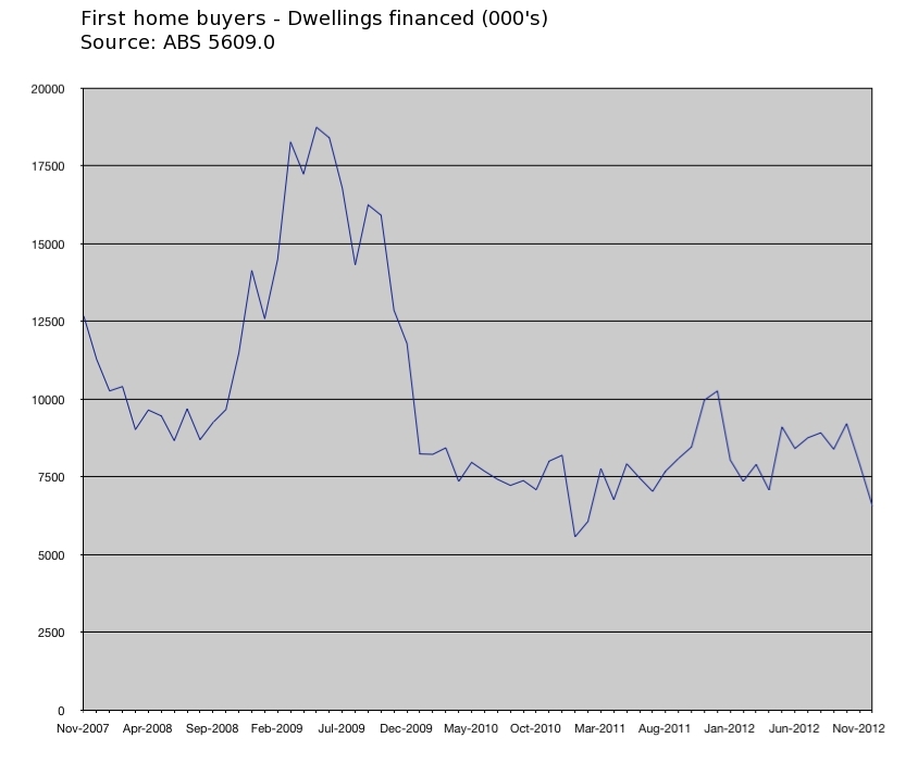 It turned down sharply as Australians wisely responded by tightening their belts, and paying down their debts.  Then began to climb again – but only a little – thanks to the Rudd government offering “free money” in the form of a doubling of the First Home Owners Grant.  This handout of what amounted to a free home loan deposit kept the bubble from collapsing.  It encouraged thousands of new buyers – mostly young people with little or no savings – to go to their bank and borrow hundreds of thousands in “credit” to go and bid up the prices of houses again.