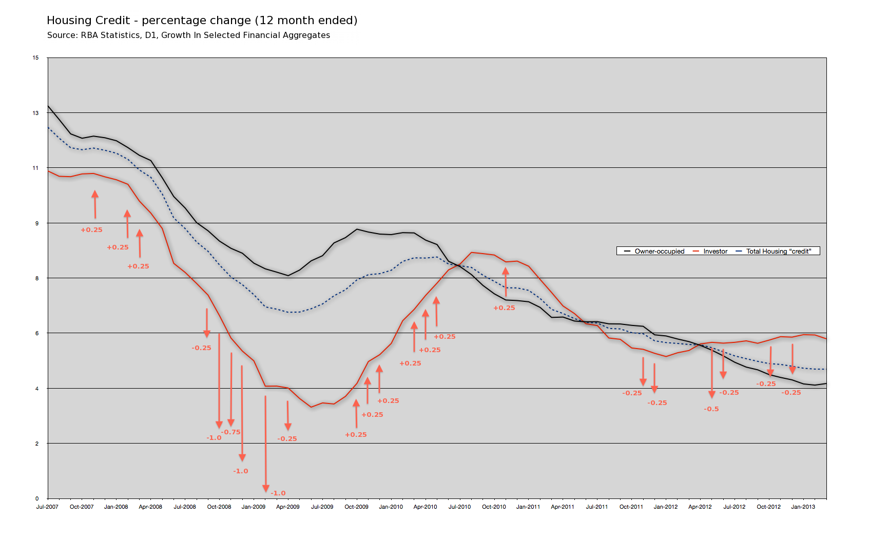 Because using interest rates to influence demand for housing “credit” — especially with “Investors” — has lost its effectiveness. And we can see this clearly, simply by zooming in on the above chart to look at the period November 2007 through to March 2013…