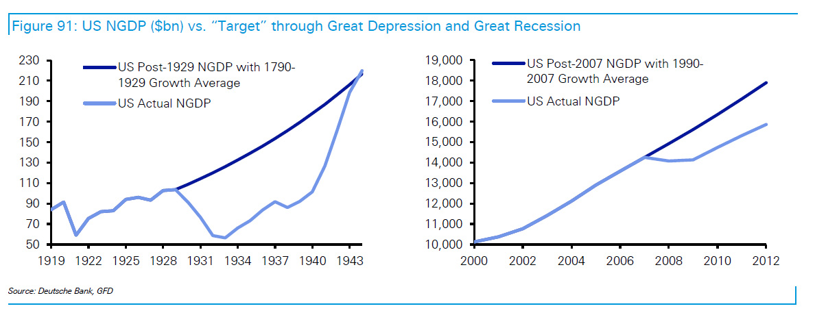 In an uncanny historical analogue of the current economic predicament, we have to go back only 70 years or so back, to the time of the first Great Depression: that was the first and ostensibly last time, when the US economy was performing in a comparably subpar fashion to trendline.