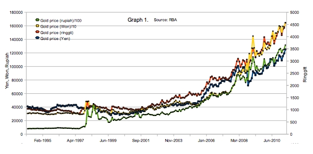 The USD gold price did not rise in 1997 but rather fell, albeit slowly, until 2001. There was no financial crisis in the US in 1997 thus no pressing need to extinguish US government debt. Instead the US financial crisis began a few years later in 2001 and continues to this day, along with every other nation. In fact only the other day I read of civil strife in Indonesia, reminiscent of 1997 onwards.