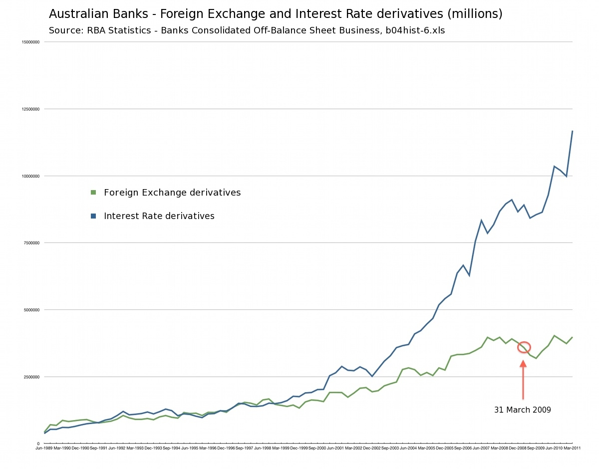 Mr Debelle must know this. Because the RBA publishes its own statistical data for our banks’ derivatives exposure – and their most recent data is current to 31 March 2011.