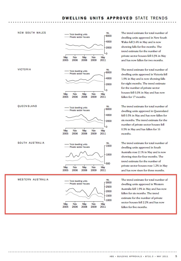 The “trend estimate for total number of dwelling units approved in Western Australia fell by 1.9% in May and has now fallen for six months.”