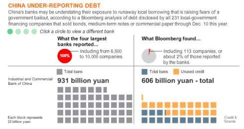 Bloomberg News tallied the debt disclosed by all 231 local government financing companies that sold bonds, notes or commercial paper through Dec. 10 this year. The total amounted to 3.96 trillion yuan ($622 billion), mostly in bank loans, more than the current size of the European bailout fund.