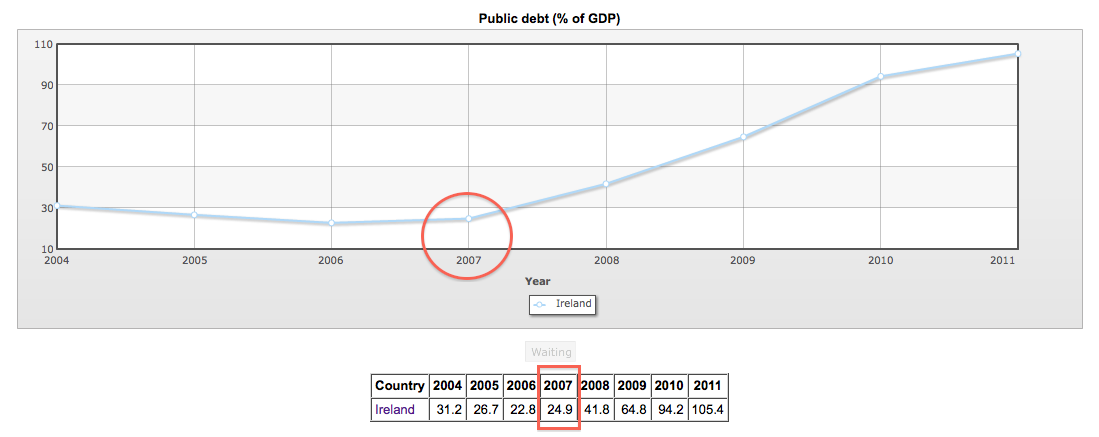 “This is the #1 reason why, even though it is true that private debt is much worse than public debt, I believe that Barnaby Is Right in constantly expressing concern over the rapidly rising trajectory of public debt in Australia. Because, regardless of whether or not you agree that our public debt is “low compared to other OECD countries,” the undeniable fact remains that our rapidly rising government debt does represent a weakening of the government’s balance sheet… even before any banking crisis arrives! Foreseeing that our banking system was, just like the rest of the West, our key vulnerability, and that weakening the government balance sheet unnecessarily would only make our future problems far more calamitous, was one of the main reasons why I launched this blog in early 2010. When you hear some distinguished-looking, eminent economic “expert” – or politician – reassuring us that Australia’s public debt is “low”, just keep one word at the front of your mind. Ireland. And remember what happens to the public debt level, when a government with previously “low” public debt suddenly finds itself borrowing to the stratosphere – often from the IMF – in trying to bail out an over-leveraged banking system.”