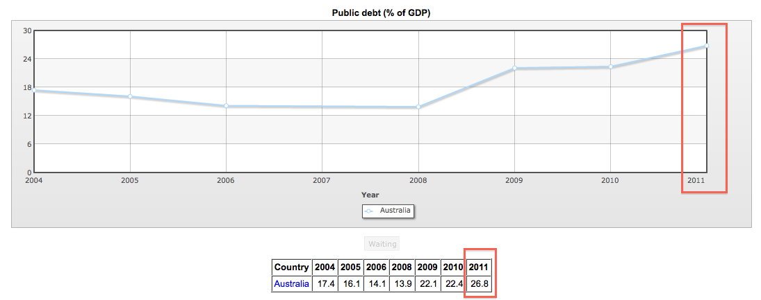 Australia’s total government debt – using the popular “as a percentage of GDP” measure (which I loathe) – is now worse than where Ireland’s was before their private debt bubble burst. And ours hasn’t. Yet. Note well: the following charts are only current through 2011; our Green-Labor government has piled on an awful lot of additional debt since then –