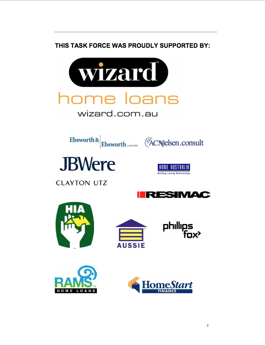 We have had some expenses for assistance with research, computing services and the like and we have therefore been fortunate in receiving generous and much appreciated support both financial and in kind from a number of organisations, including Wizard Home Loans, the Housing Industry Association, JBWere, Booz Allen & Hamilton, Aussie Home Loans, Resimac, RAMS Home Loans, HomeStart Finance, Clayton Utz, Ebsworth & Ebsworth, Phillips Fox, ACNielsen.consult, and Home Australia.
