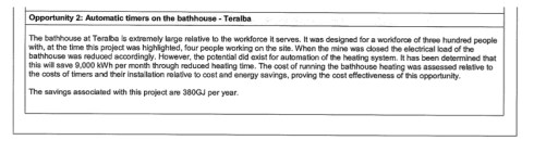 2009 Opportunity 2 – Put automatic timers on the Teralba bathhouse. The one we built for 300 miners, but now only has 4 staff, because we closed the mine: